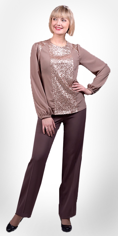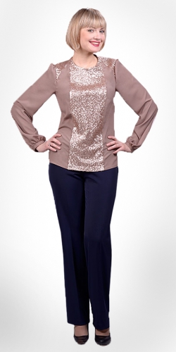 Легкая блуза из креповой ткани украшена вставкой из мерцающих пайеток. В комплекте с классическими брюками в благородных кофейно-бежевых тонах создается образ стильной и уверенной в себе женщины.