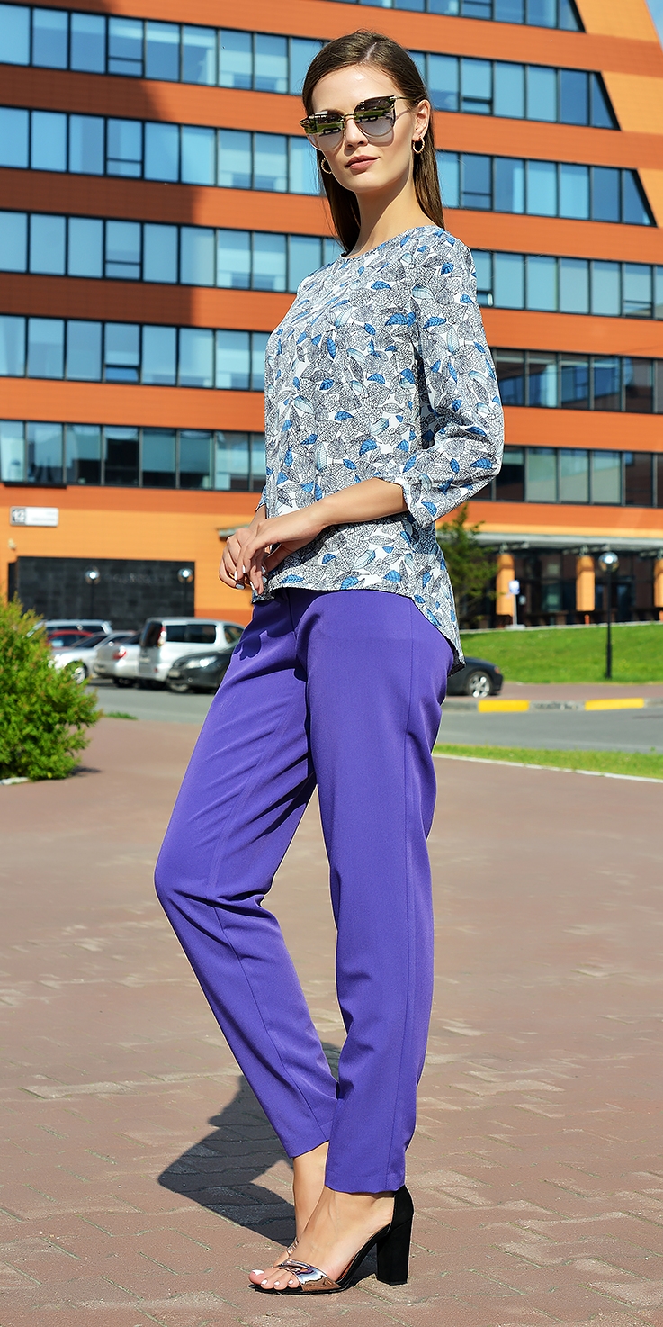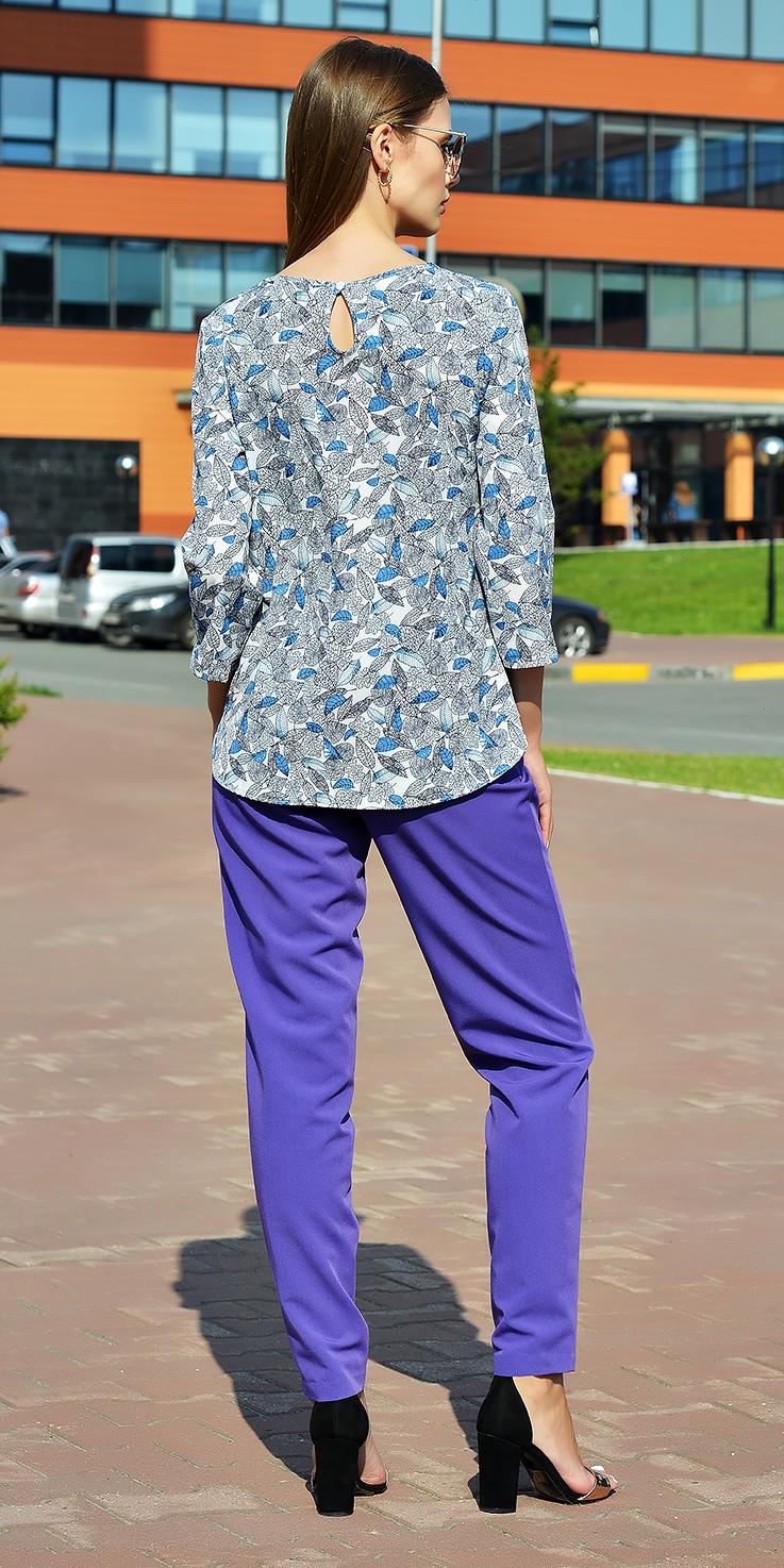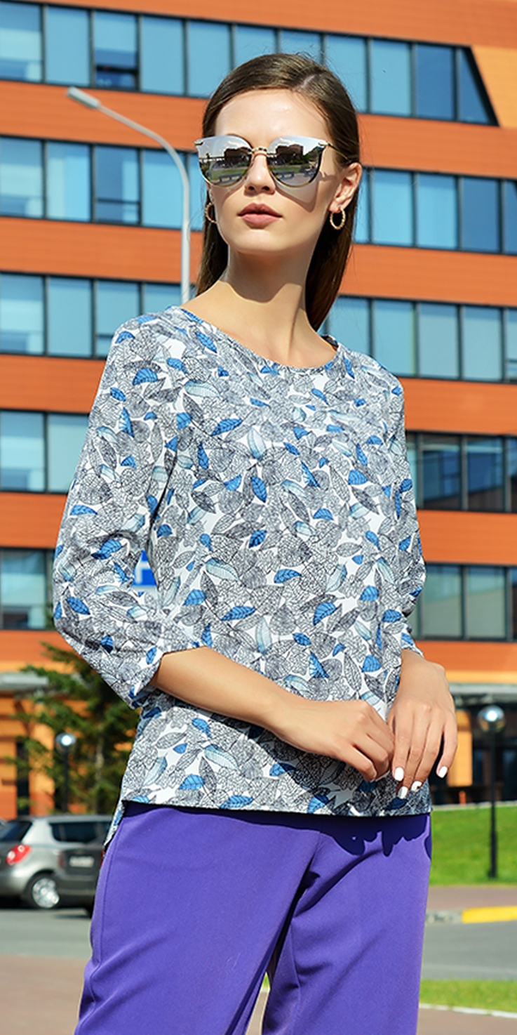 Лаконичная блузка прямого силуэта из принтованной ткани. Вырез горловины округлый. Рукав втачной 3/4, с фигурным низом. Спинка длиннее переда на 6 см. На спинке "капелька" и застежка на пуговицу. Отлично сочетается с разными моделями брюк и юбок.