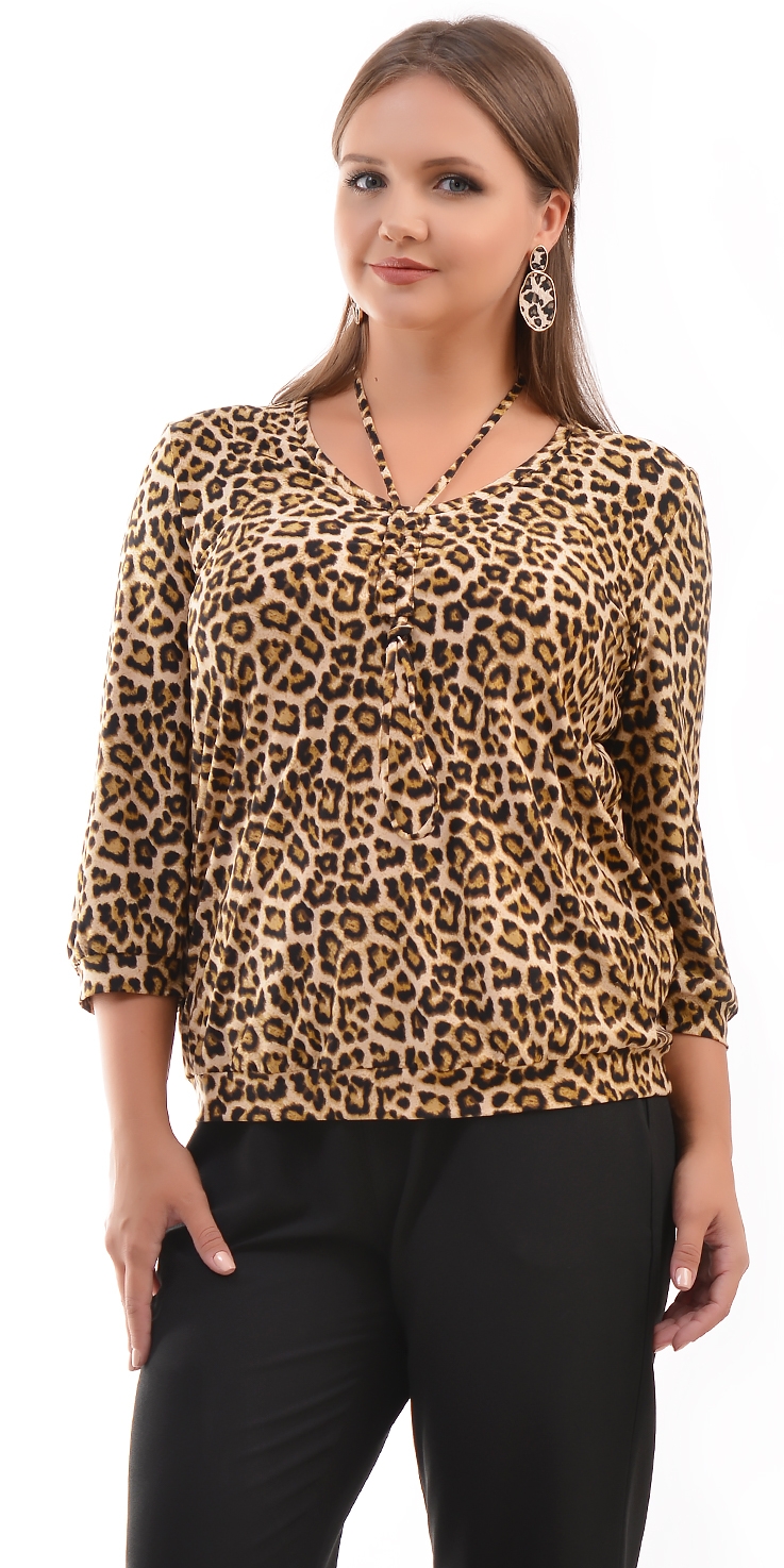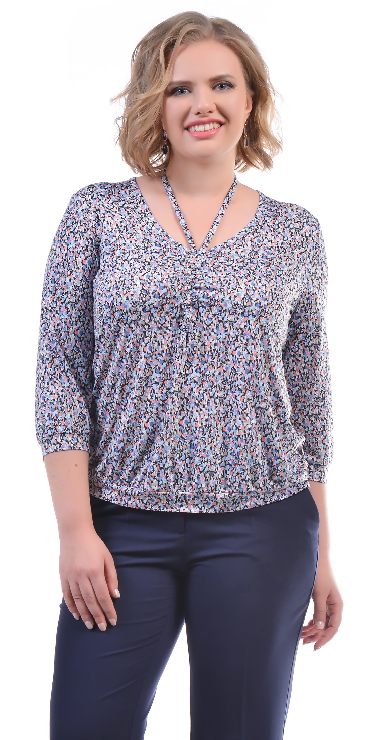 Блузка свободного силуэта из принтованного трикотажа «масло». Вырез горловины U-образной формы. Рукав длиной 3/4 на манжете.