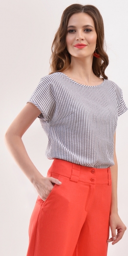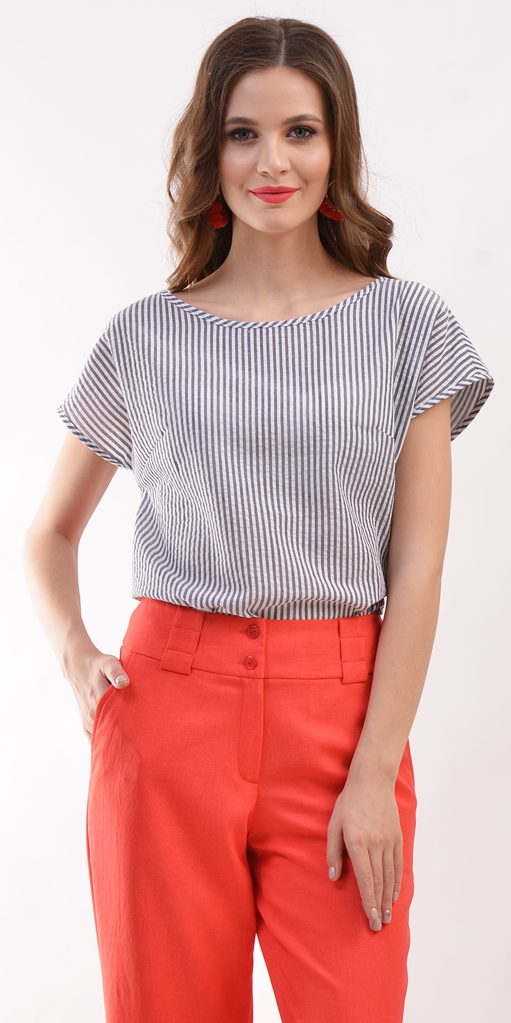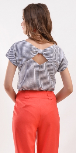 Блузка прямого силуэта из легкой ткани в тонкую полоску. Блузка с вырезом горловины «лодочка» по переду, и оригинальной открытой спинкой с кокеткой в виде банта.