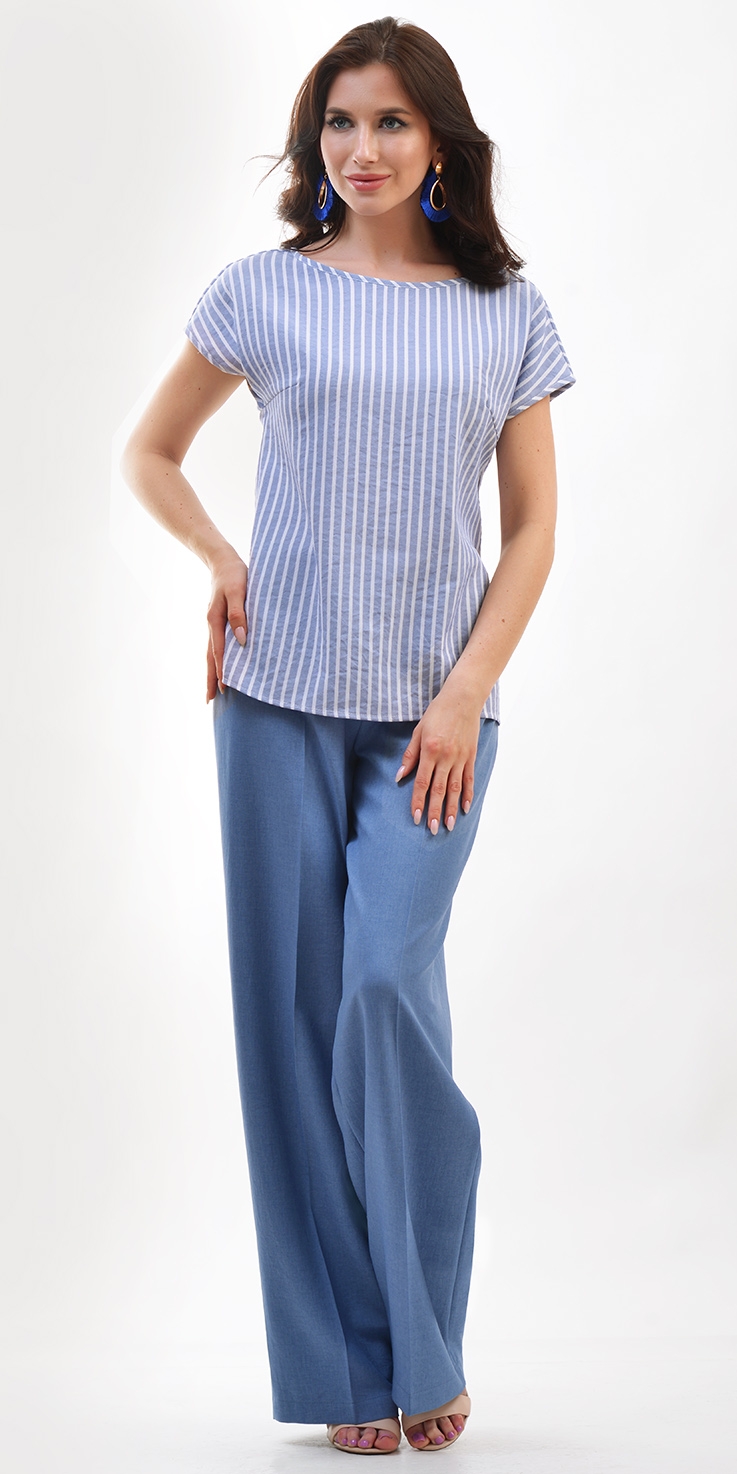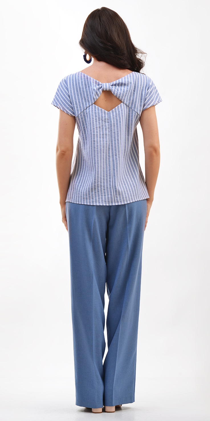 Блузка полуприлегающего силуэта из легкой ткани с контрастной полоской. Блузка с вырезом горловины «лодочка» по переду, и оригинальной открытой спинкой с кокеткой в виде банта.