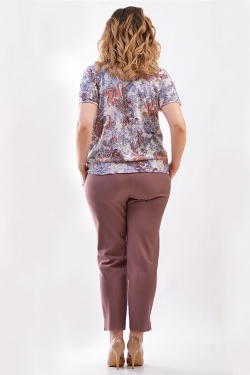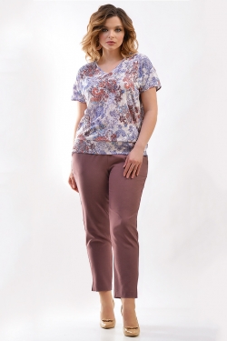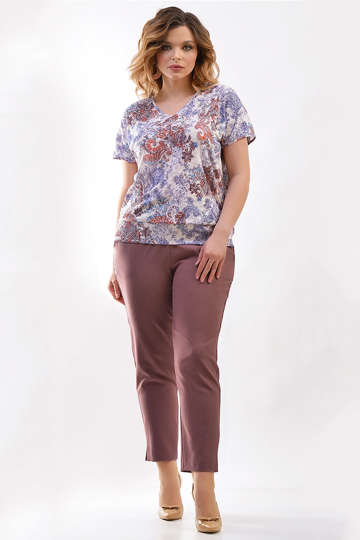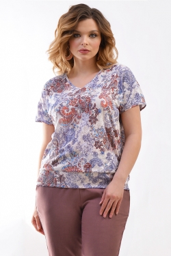 Блузка из принтованного трикотажа со спущенным плечом. Вырез горловины V-образный. Низ изделия посажен на пояс. Без застежки.