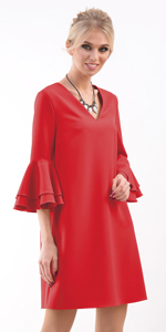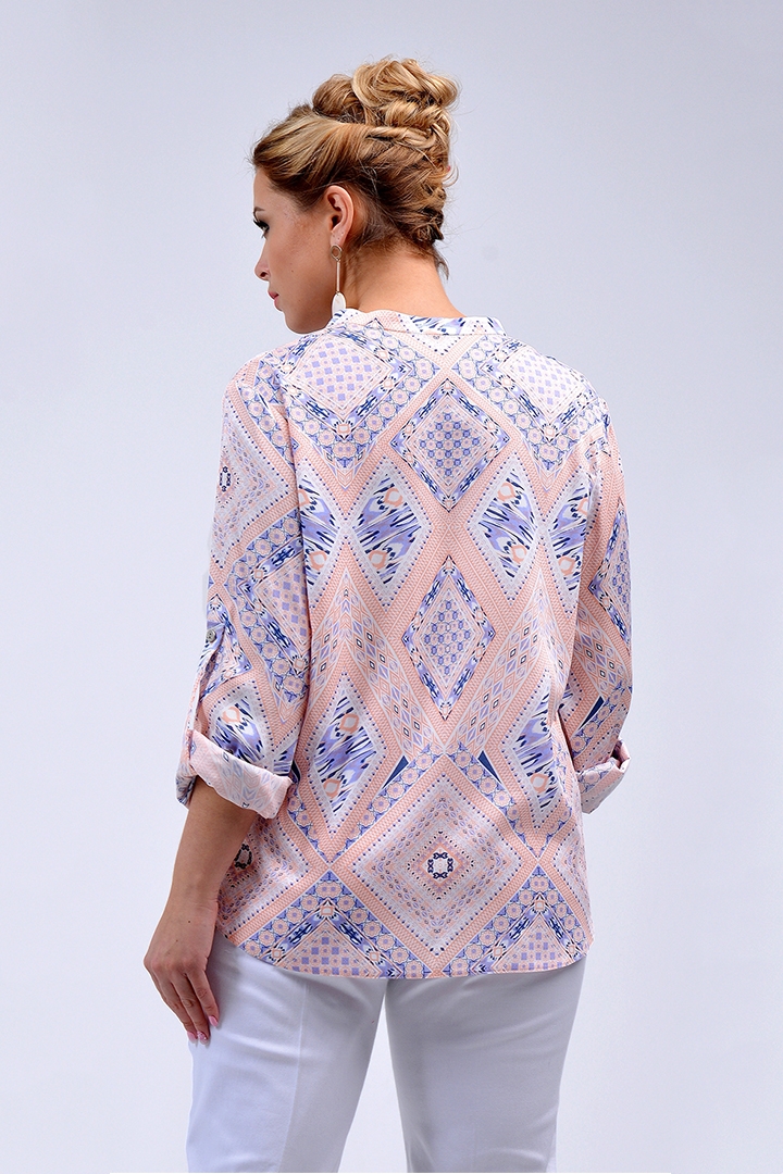 С завернутым рукавом туника становится более легкой, превращаясь в непринужденный круизный вариант. Интересно выполнена область горловины: стойка переходит в V-образный вырез, дополненный люверсами и декоративной шнуровкой. Нежный геометричный принт в этническом стиле соответствует одному из трендов сезона.