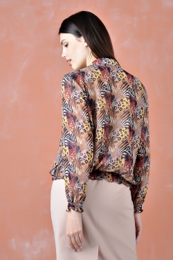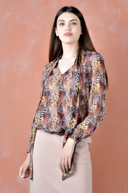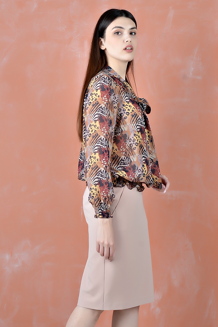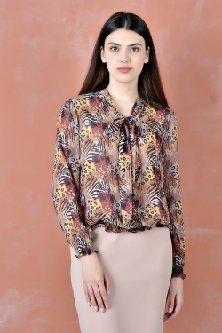 омантичная блузка из шифона с бантом. Силуэт прямой. Рукава и низ блузки присборены на резинку. Отличный вариант как для праздника, так и для офиса. Рекомендуем носить с брюками или с юбкой.