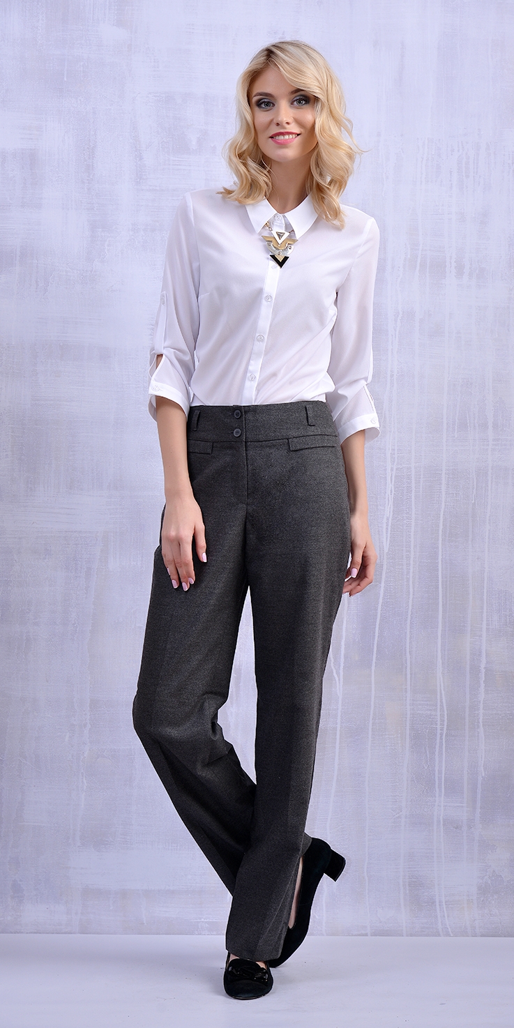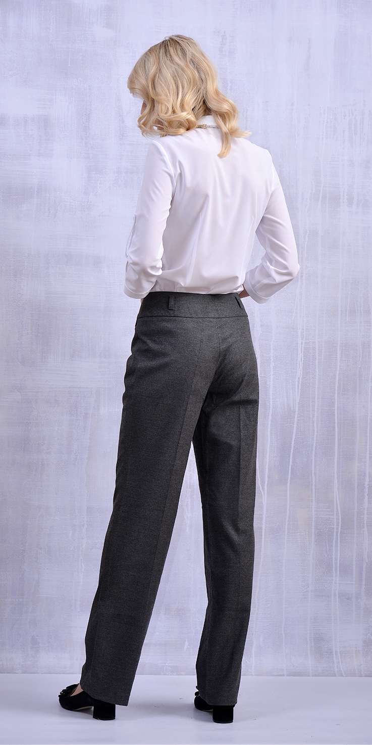 Прямые брюки со стрелками из костюмной ткани. Брюки на широком поясе. По переду имитация карманов с листочкой. Застежка на молнию и пуговицы.