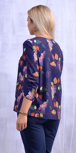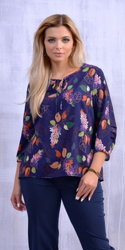Блузка из эластичной ткани с модным принтом, рукавами 3/4 и декоративными защипами. Круглый вырез горловины оформлен капелькой и завязками.