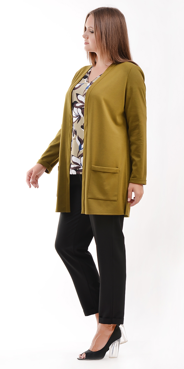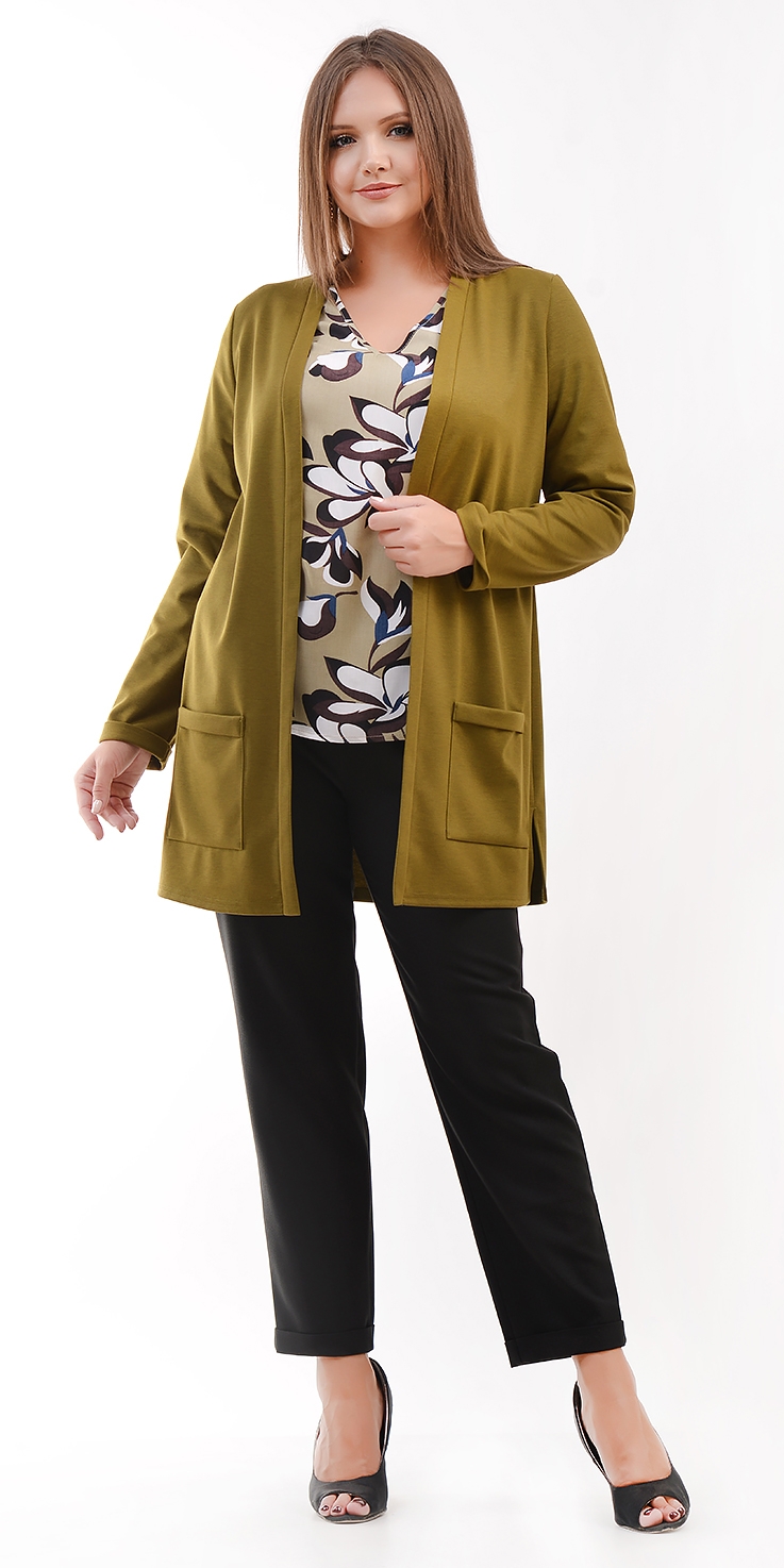 Укороченные, зауженные брюки из крепа. Брюки на поясе (ширина 4 см) с резинкой по бокам. В боковых швах карманы. По низу отвороты. Без застежки.