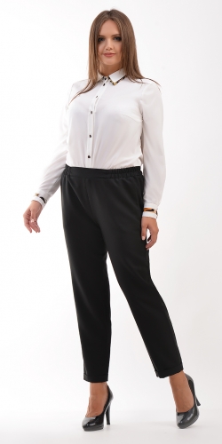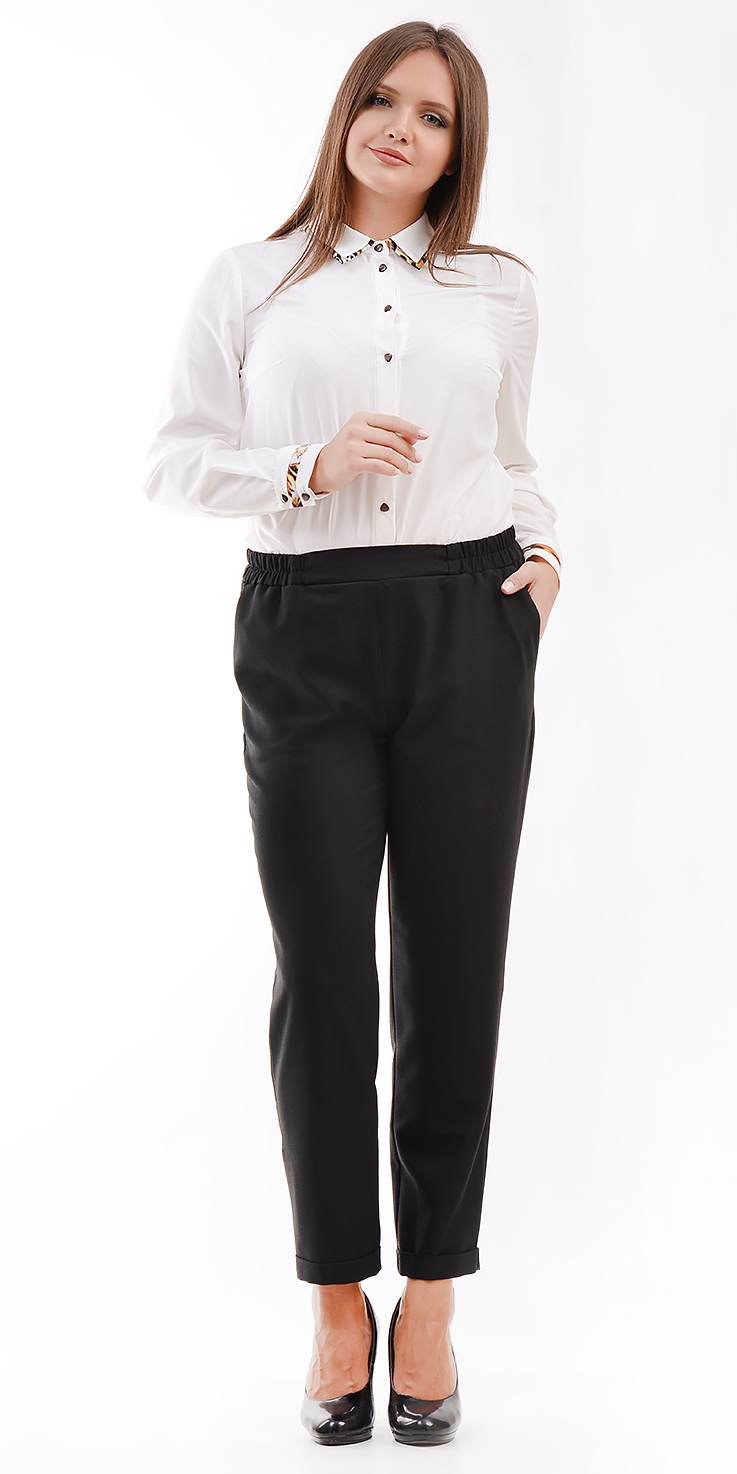 Укороченные, зауженные брюки из крепа. Брюки на поясе (ширина 4 см) с резинкой по бокам. В боковых швах карманы. По низу отвороты. Без застежки.