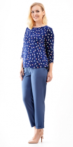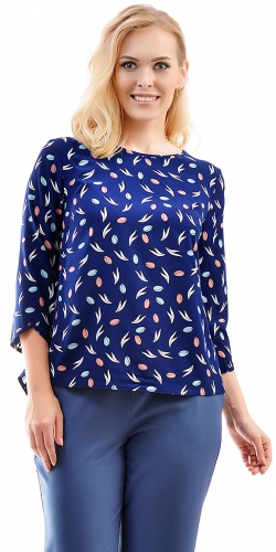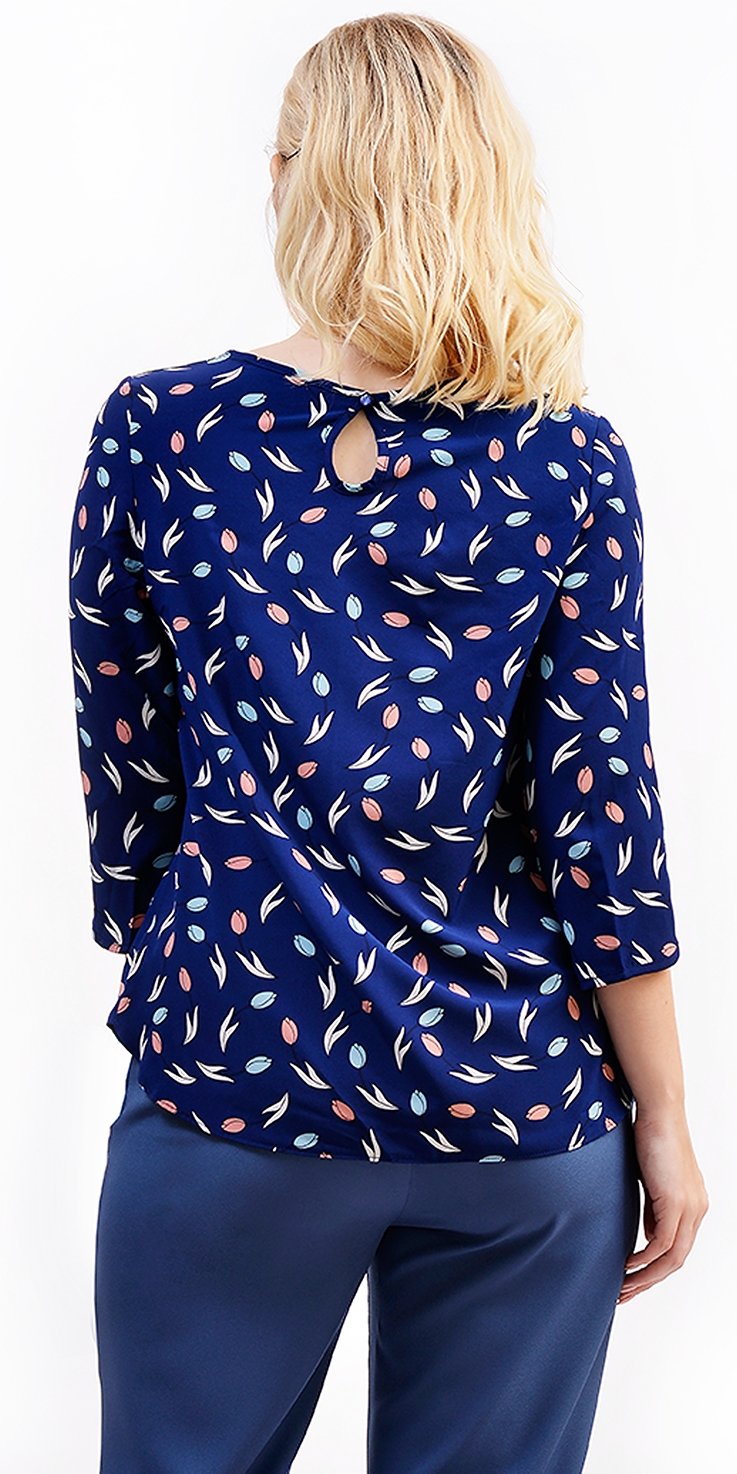 Лаконичная блузка прямого силуэта из принтованной ткани. Вырез горловины округлый. Рукав втачной 3/4, с фигурным низом. Спинка длиннее переда на 6 см. На спинке "капелька" и застежка на пуговицу. Отлично сочетается с разными моделями брюк и юбок.