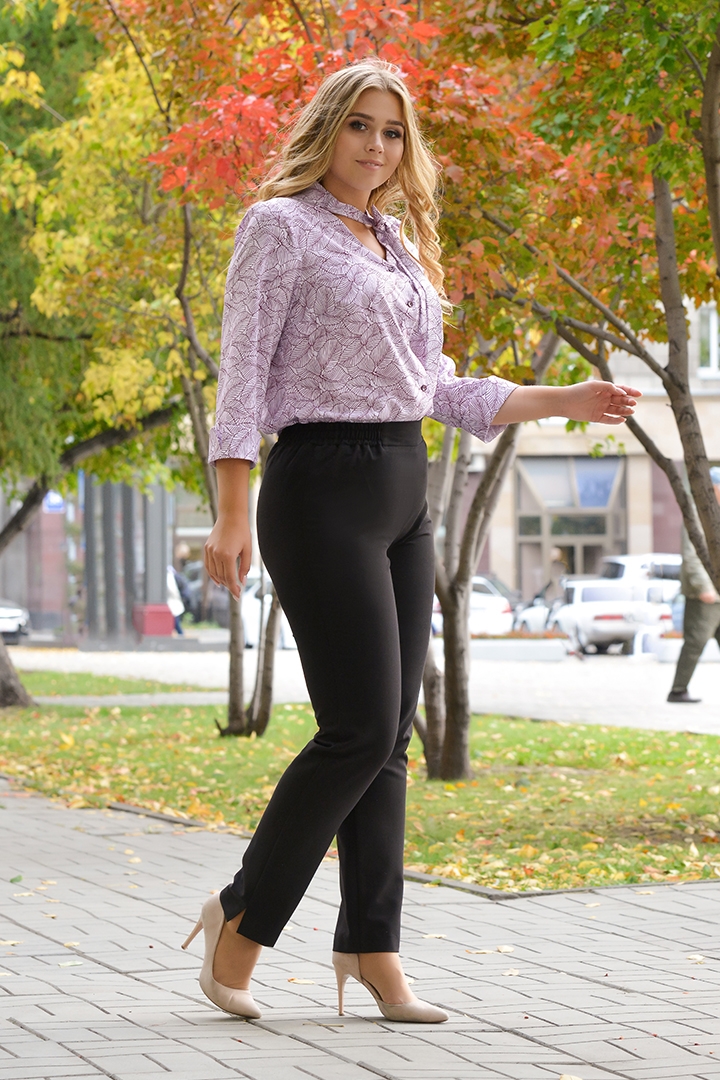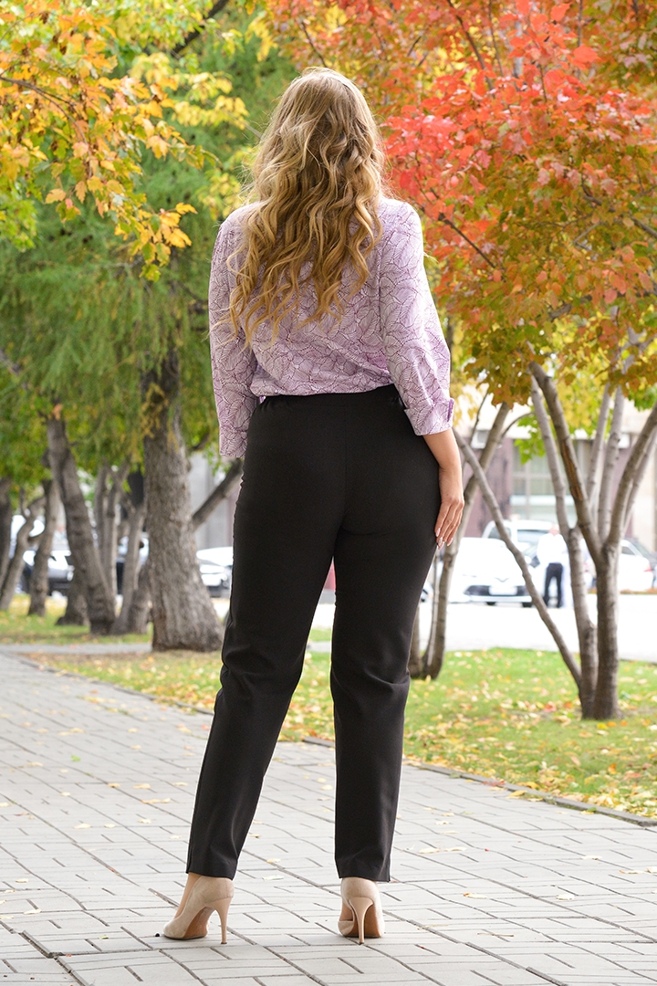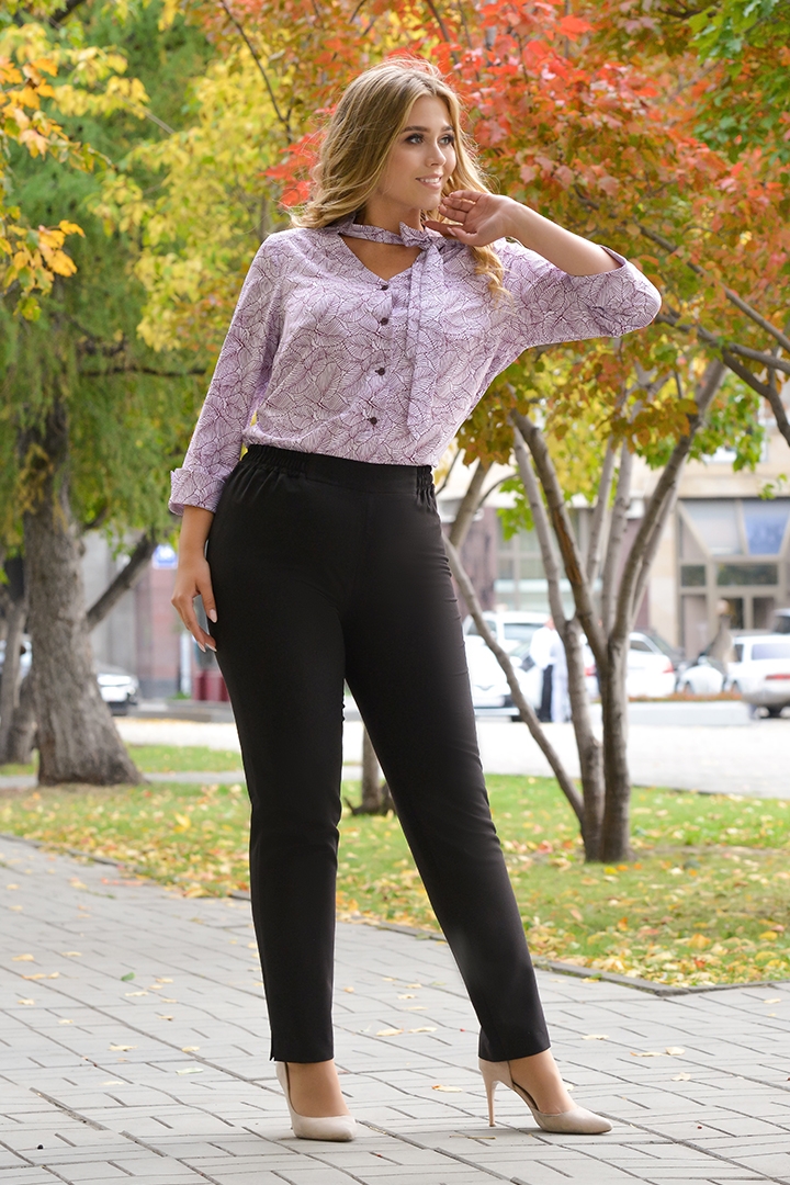Брюки из костюмной ткани прямого силуэта с разрезами по низу. Верх брюк на поясе и на резинке.