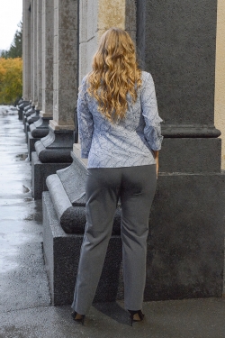 показать все описаниеПрямые брюки, с застроченной стрелкой из костюмной ткани с добавлением вискозы. Застежка на 2 пуговицы и молнию. На поясе декоративная отделочная строчка и шлевки для ремешка. По спинке вытачки.