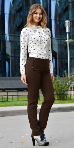 Зауженные брюки из костюмной ткани с отрезной боковой частью. В передних швах карманы. Застежка по переду на молнию и крючки.