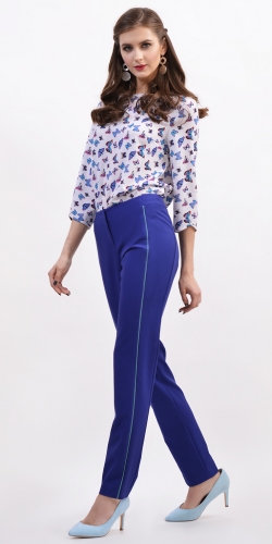 Зауженные брюки из костюмной ткани, с отрезной боковой частью. В переднем шве кант из контрастной ткани. Застежка по переду на молнию и крючки.