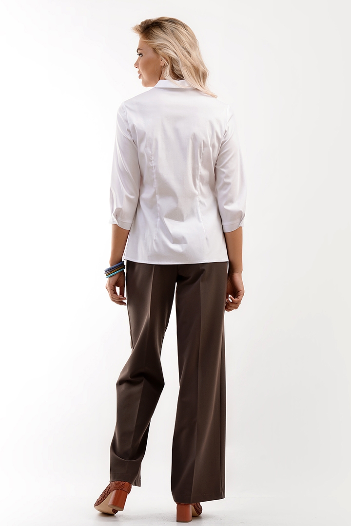 Широкие прямые брюки из костюмного вискозы со швами и разрезами по переду. Брюки на поясе, с высокой посадкой. Застёжка в боковом шве на молнию и пуговицу.