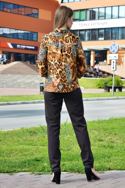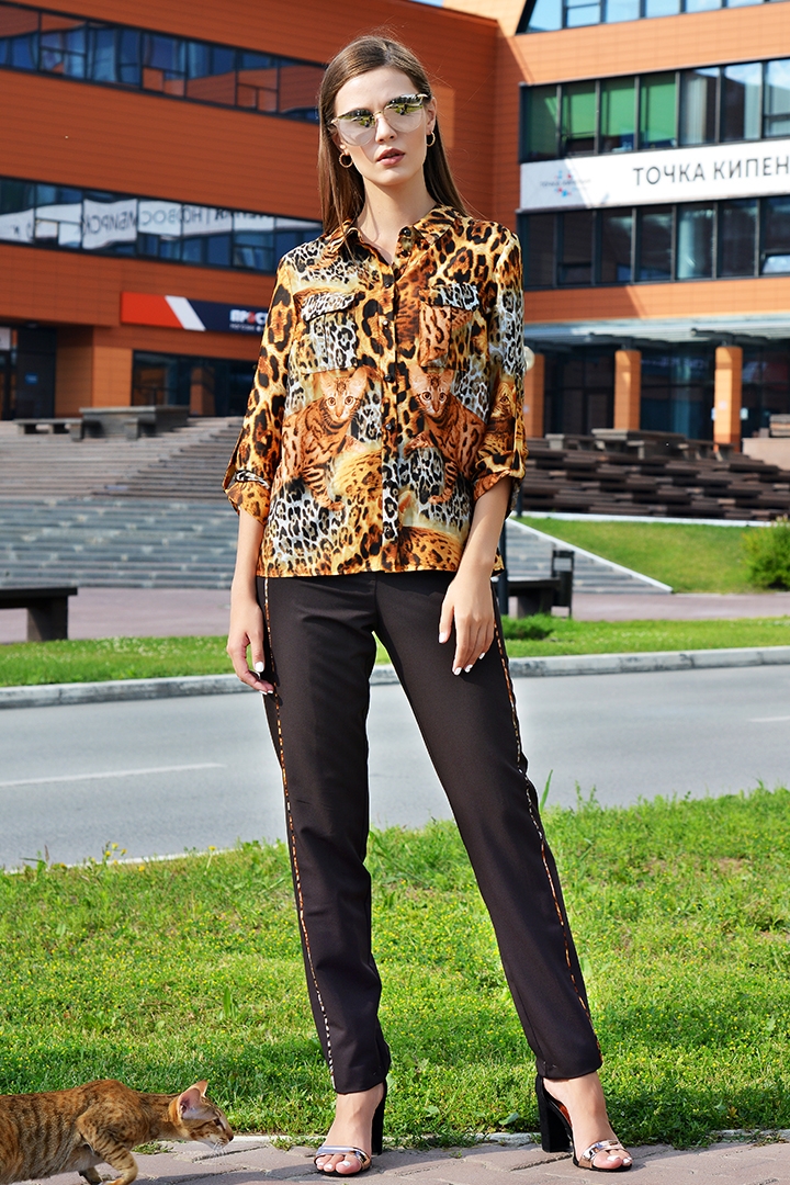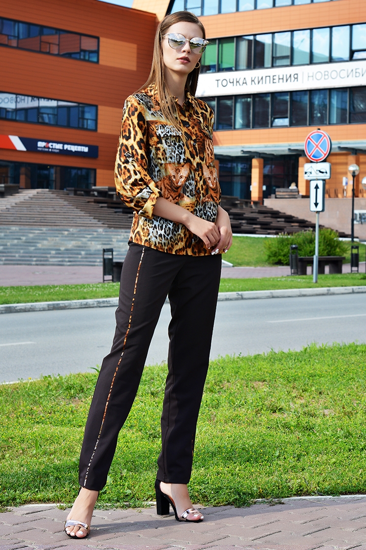 Зауженные брюки из костюмной ткани, с отрезной боковой частью. В переднем шве кант из контрастной ткани. Застежка по переду на молнию и крючки.