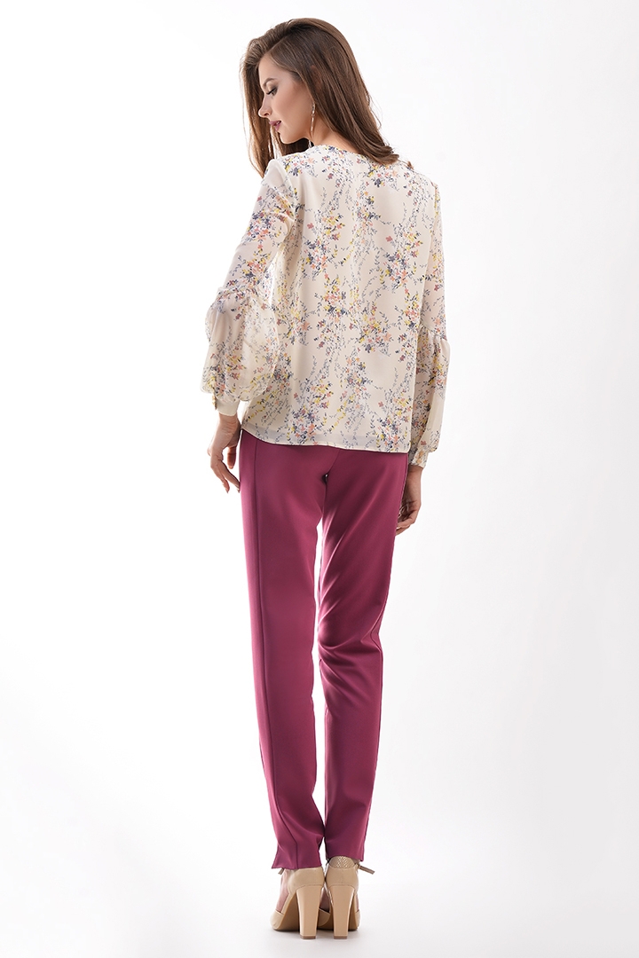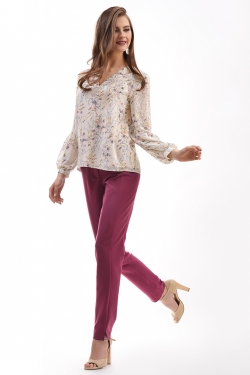 Зауженные брюки из костюмной ткани, с отрезной боковой частью. В переднем шве внизу небольшие разрезы. Застежка по переду на молнию и крючки.
