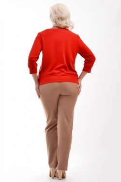 Прямые брюки, с застроченной стрелкой из костюмной ткани с добавлением вискозы. Застежка на 2 пуговицы и молнию. На поясе декоративная отделочная строчка и шлевки для ремешка. По спинке вытачки.
