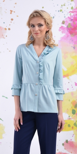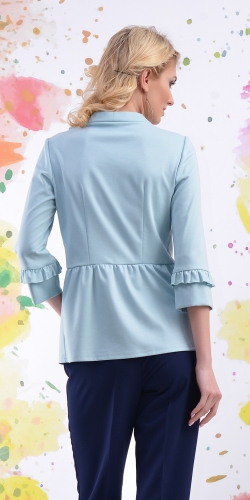 Кардиган полуприлегающего силуэта из трикотажа ,с отрезной деталью и сборкой по линии талии. Рукав втачной, с манжетом и декоративной рюшей.