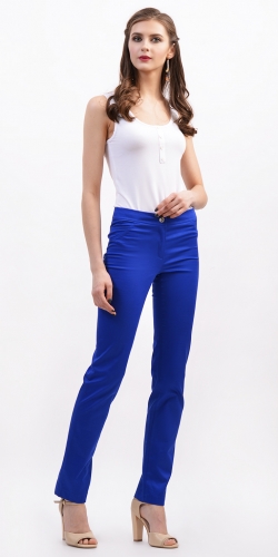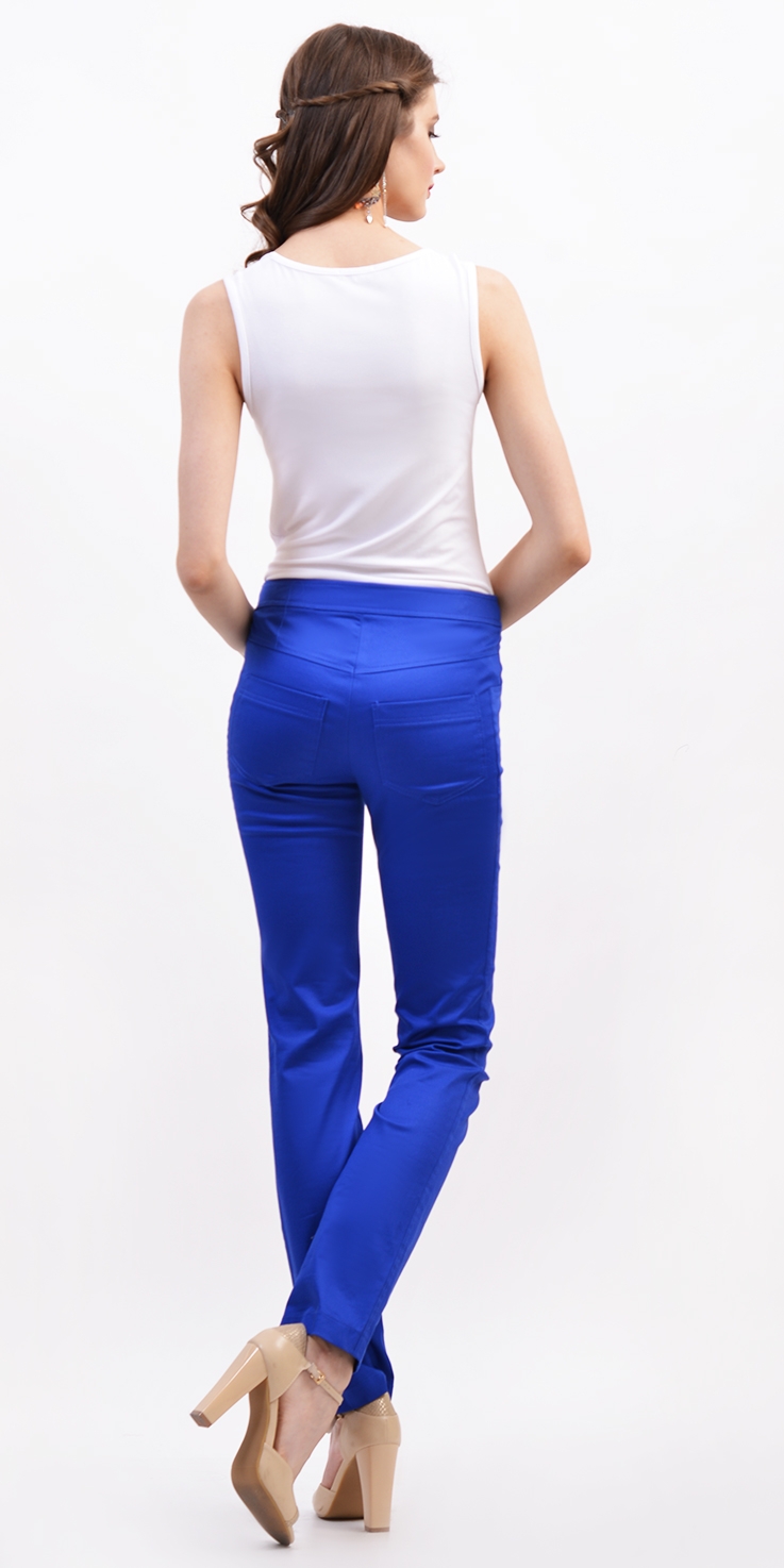 Зауженные брюки из сатин хлопка. Брюки на поясе (ширина 3,5 см), на спинке фигурная кокетка. По переду имитация карманов, на спинке накладные карманы. Застежка на пуговицу и молнию.