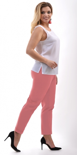 Укороченные, зауженные брюки из легкого крепа. Брюки на поясе (ширина 4 см) с резинкой по бокам. В боковых швах карманы. По низу отвороты. Без застежки.