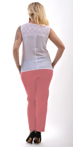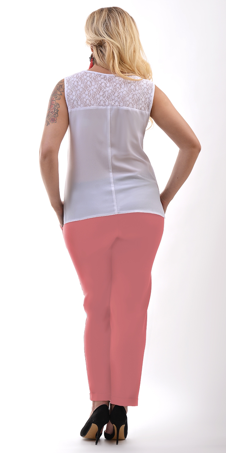 Топ из тонкой креповой ткани с круглым вырезом горловины и кружевными кокетками по переду и спинке. На спинке средний шов, в боковых швах разрезы.