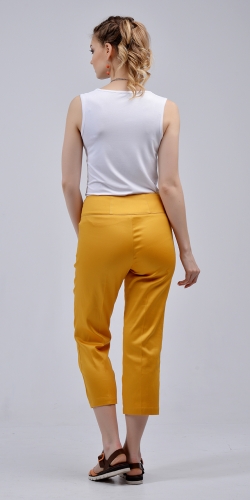 Капри прямого силуэта из сатин хлопка. Капри на широком поясе-кокетке (8,5 см). По переду прорезные карманы. Застежка по переду на молнию и пуговицы.