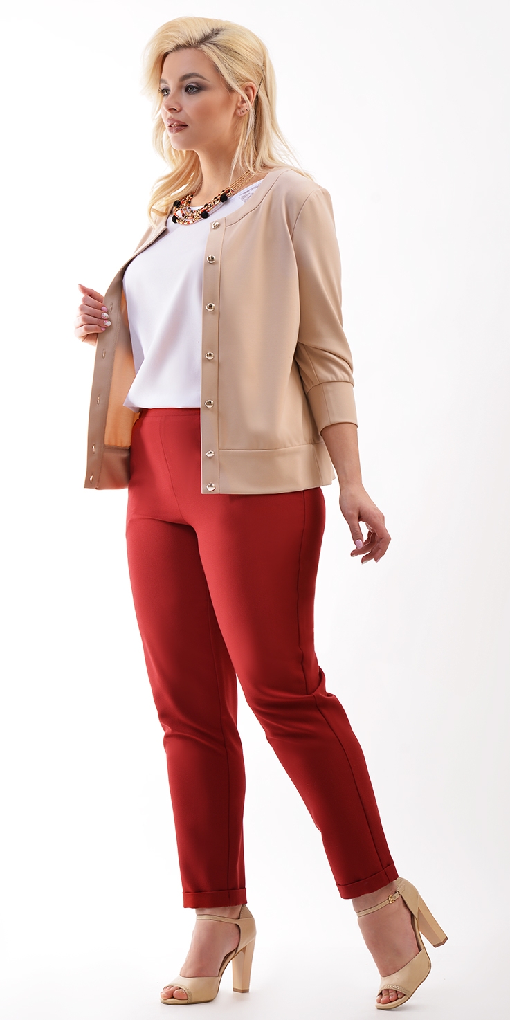 Укороченные, зауженные брюки из легкого крепа. Брюки на поясе (ширина 4 см) с резинкой по бокам. В боковых швах карманы. По низу отвороты. Без застежки.