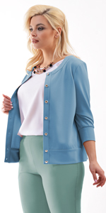 Кардиган из плотного, гладкого трикотажа прямого силуэта. Рукава 3/4 на манжетах. По низу изделия широкий пояс. Застежка по планке на пуговицы.