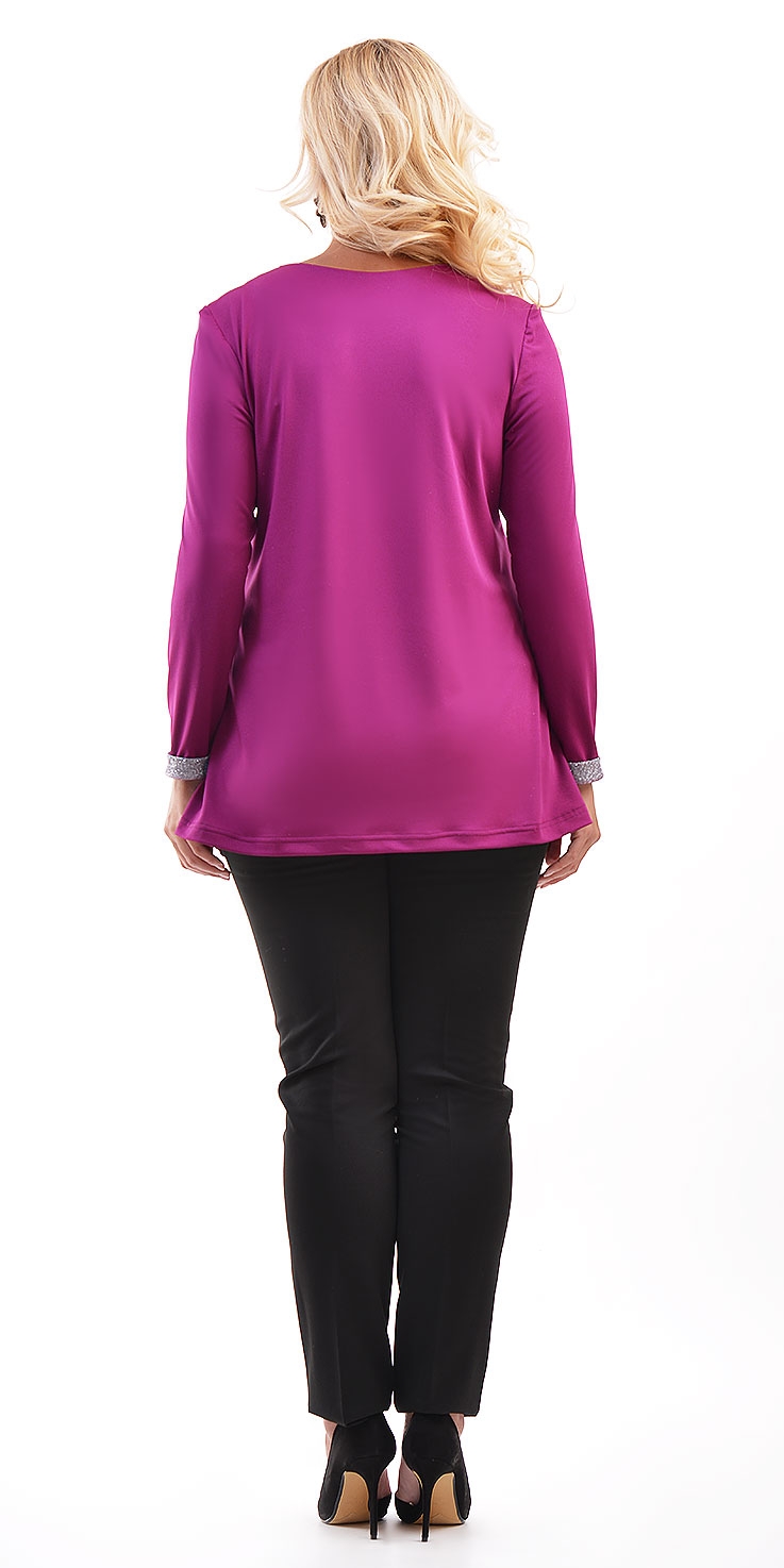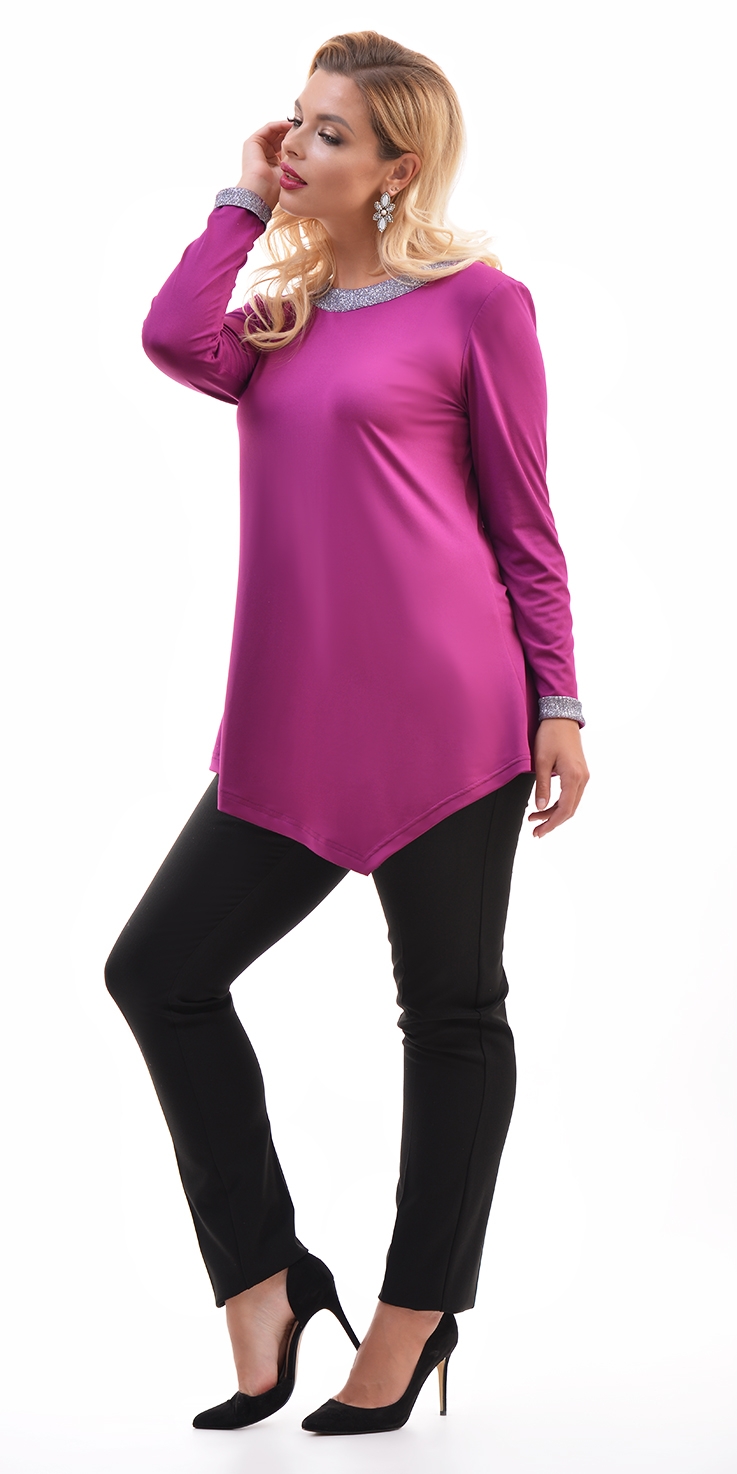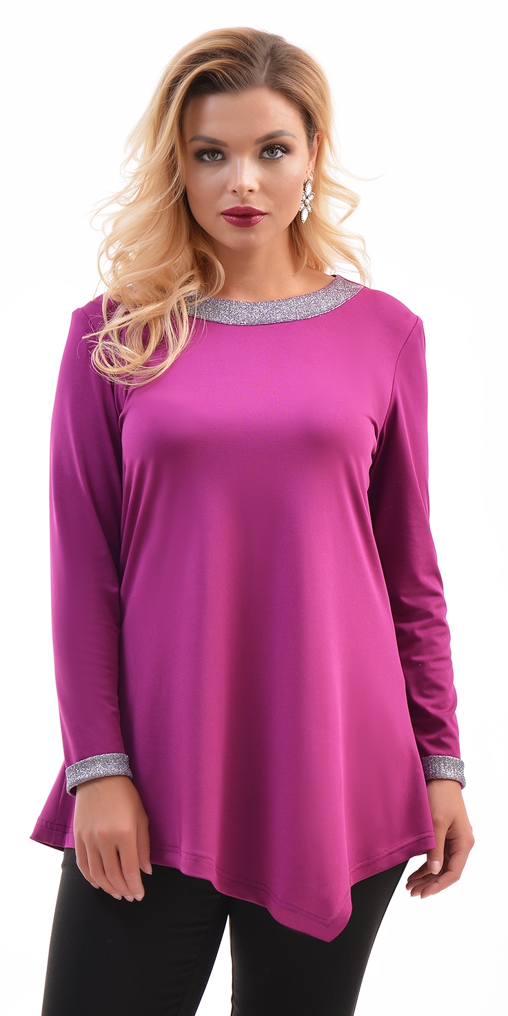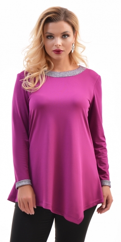Нарядная туника из тонкого трикотажа А-силуэта, с круглым вырезом горловины, длинными рукавами и ассиметричным низом. По горловине и рукавам отделка из блестящей ткани.