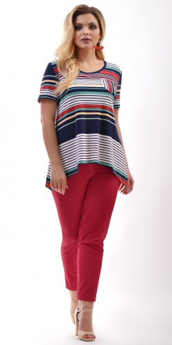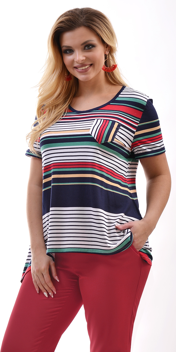 Туника из трикотажа с короткими рукавами и удлиненными боковыми швами. Вырез горловины округлый. На переде накладной карман. Без застежки.