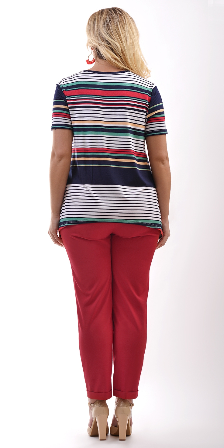 Укороченные, зауженные брюки из легкого крепа. Брюки на поясе (ширина 4 см) с резинкой по бокам. В боковых швах карманы. По низу отвороты. Без застежки.
