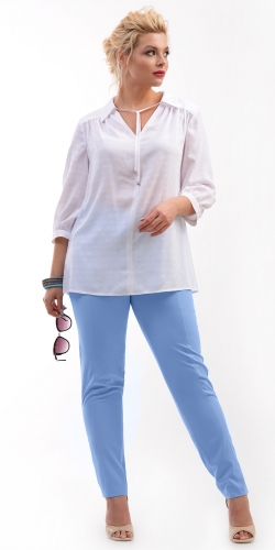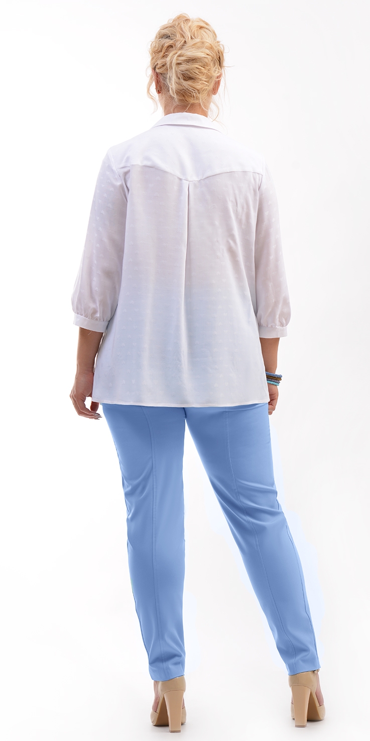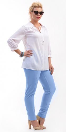 Туника длиной до бедер из легкой вискозной ткани. Воротник отложной на стойке с декоративными завязками, вырез горловины V-образной формы. Рукав широкий, длиной 3/4, на манжете со сборкой по низу. По переду и спинке фигурная кокетка. Перед со средним швом и сборкой по кокетке. Без застежки.