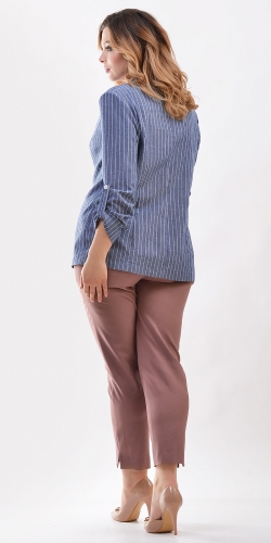Летний жакет полуприлегающего силуэта из льна в тонкую полоску. Воротник пиджачного типа. Рукав длинный с патой. По переду и спинке рельефные швы, на спинке средний шов. Застежка по переду на пуговицы.