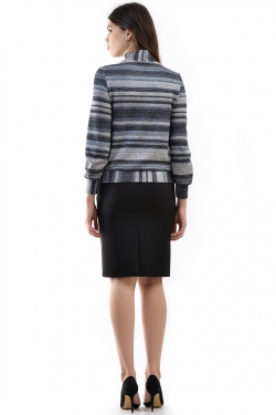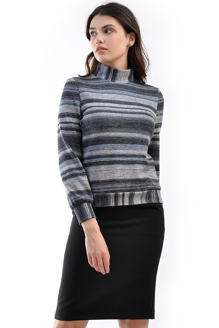 Стильный джемпер из трикотажа с длинными рукавами на манжетах и воротником стойкой.