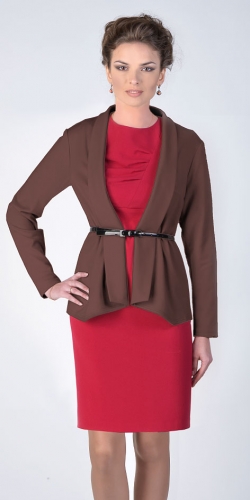 Платье прилегающего силуэта. Брусничный цвет притягивает взгляды. Мягкие складки выгодно подчеркивают зону декольте. Уютность образу добавит мягкий кардиган.