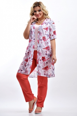 Комплект состоит из длинной шифоновой рубашки и брюк из вискозной ткани. Рекомендуется носить с топом. Предназначен для офиса или летнего отдыха.