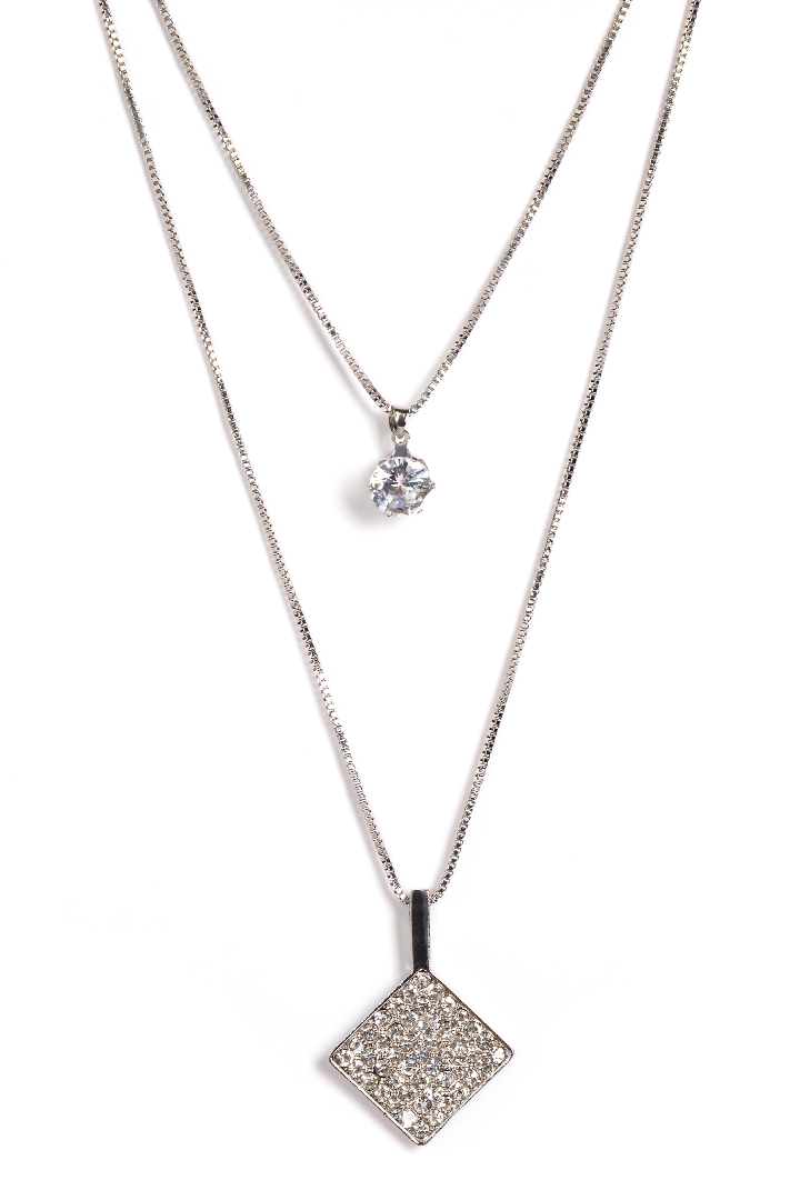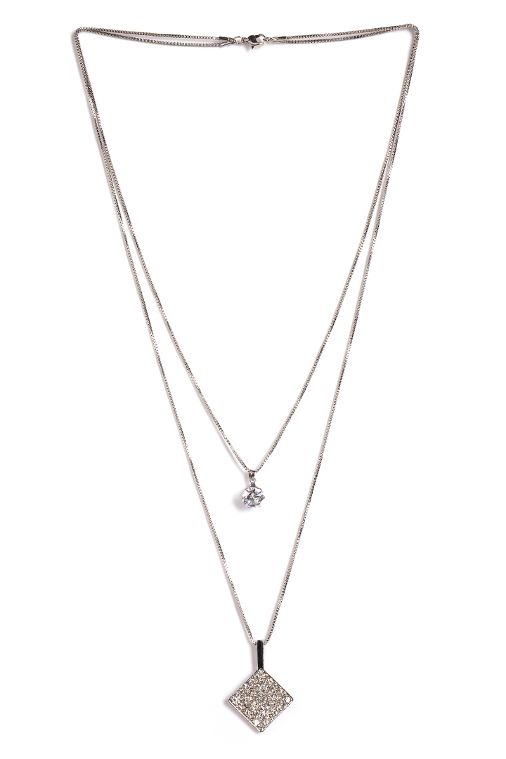 Дополните ваш образ элегантным кулоном в виде ромба украшенного стразами. Кулон на цепочке, покрытие - "серебро". Длина цепочки - 38 см