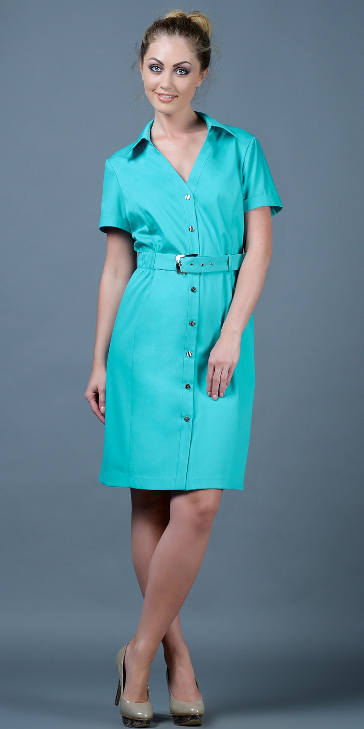 показать все описаниеСтильное офисное платье прилегающего силуэта создаёт деловой и современный образ за счёт модного покроя – платья-рубашки, навеянного европейскими трендами. Строгие детали, такие как воротник на стойке, короткие рукава с манжетами, пояс с застежкой на пряжку придают модели официальность, а V-образный вырез горловины, вертикальные рельефы, сборка по талии – вытягивают и моделируют силуэт. Плотный вискозный материал, благодаря своей структуре, хорошо держит форму и позволяет скрыть мелкие недостатки фигуры.