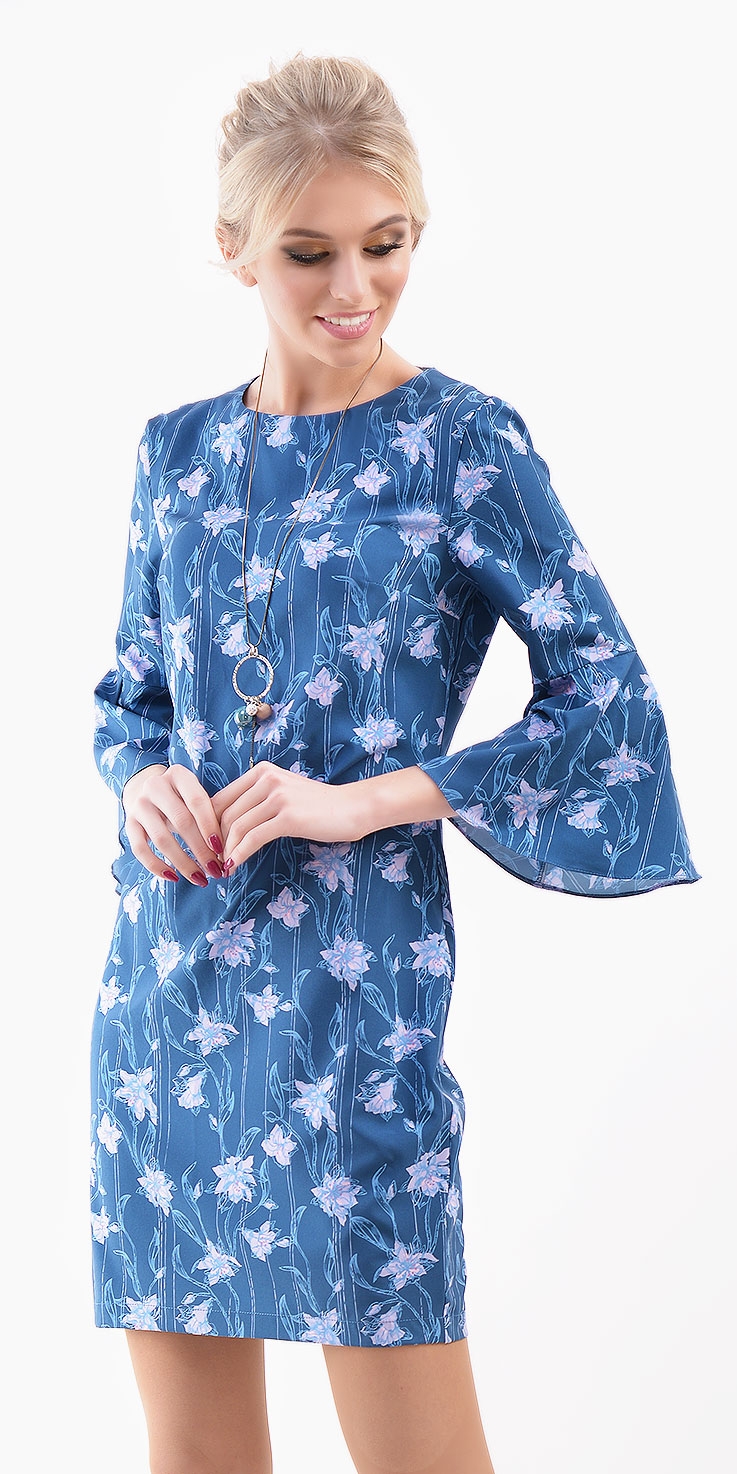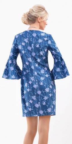 Нарядное платье полуприлегающего силуэта с круглой горловиной, рукавами 3/4 и воланами.