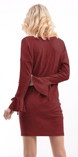 показать все описание Платье из трикотажа прямого силуэта, с вырезом горловины «лодочкой», длинными рукавами с воланами и завязками на бант. Без застежки.