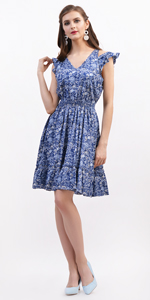 Платье-футляр из жаккардовой ткани, с рельефами по переду и открытыми плечами. Рукав 3/4 с воланом п