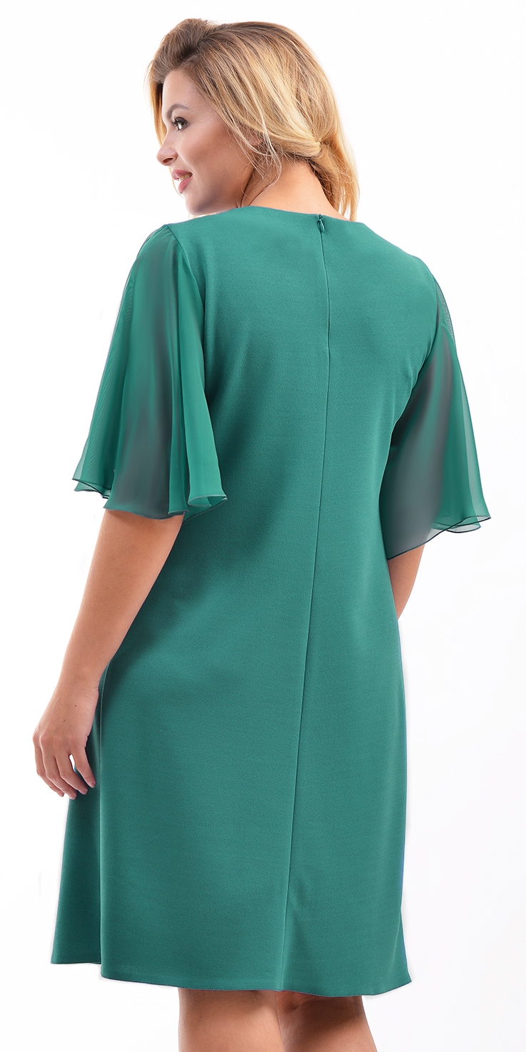 Платье трапециевидного силуэта из креповой ткани с расклешенными рукавами из шифона. Вырез горловины округлый, украшен стразами. По спинке средний шов и застежка на короткую потайную молнию.