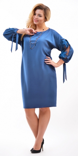 Платье О-образного силуэта со спущенным плечом из крепового трикотажа. Рукава 3/4 со вставкой из кружева и манжетой переходящей в завязки. Вырез горловины овальной формы. На спинке средний шов. Без застежки.