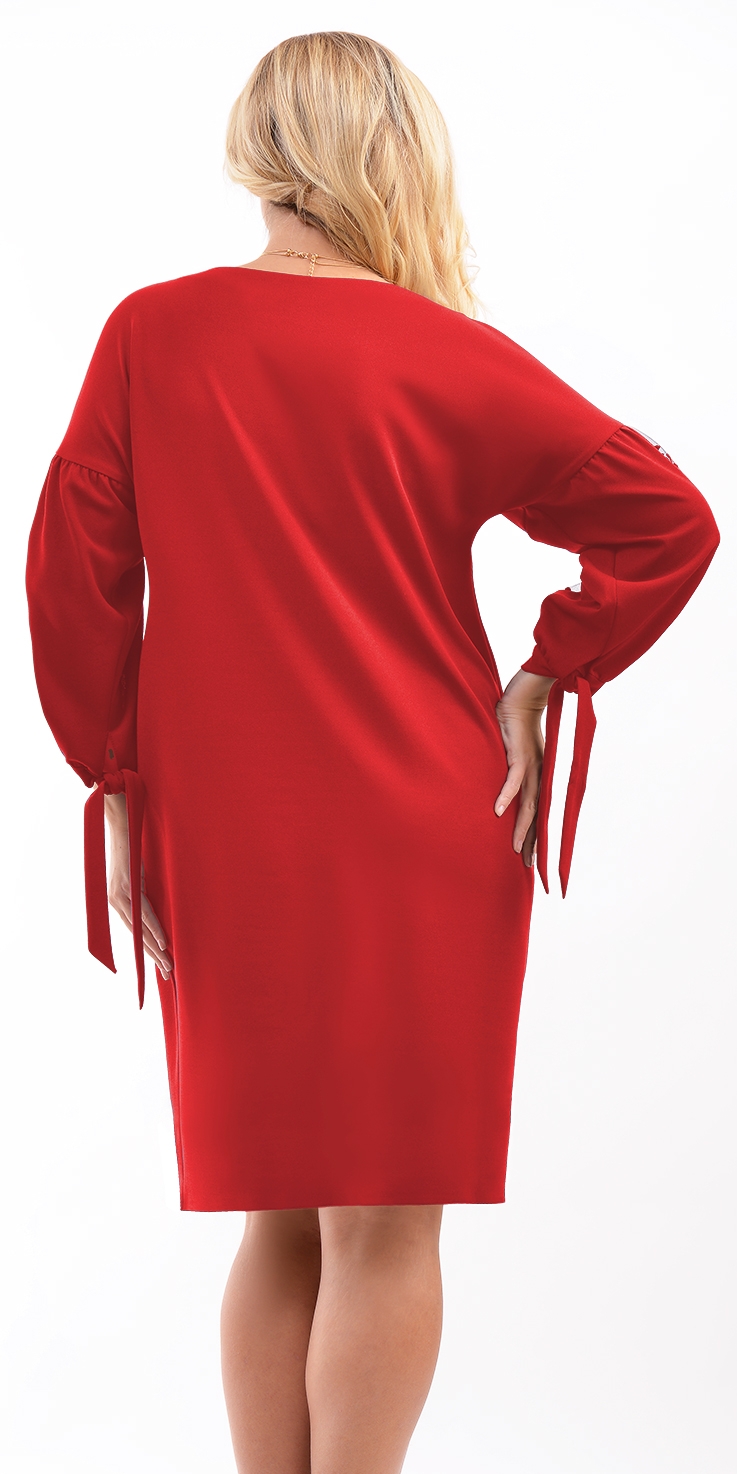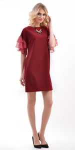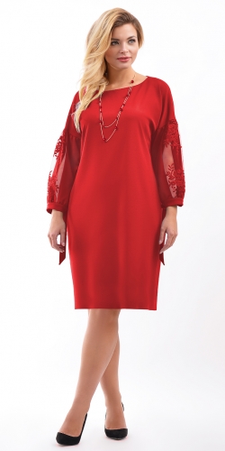 Платье О-образного силуэта со спущенным плечом из крепового трикотажа. Рукава 3/4 со вставкой из кружева и манжетой переходящей в завязки. Вырез горловины овальной формы. На спинке средний шов. Без застежки.