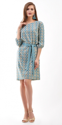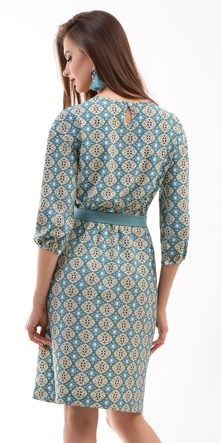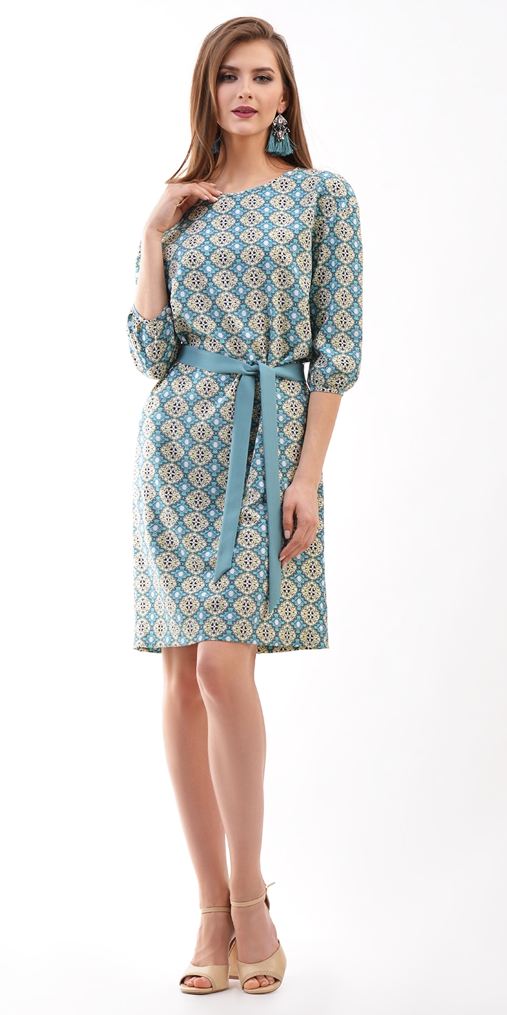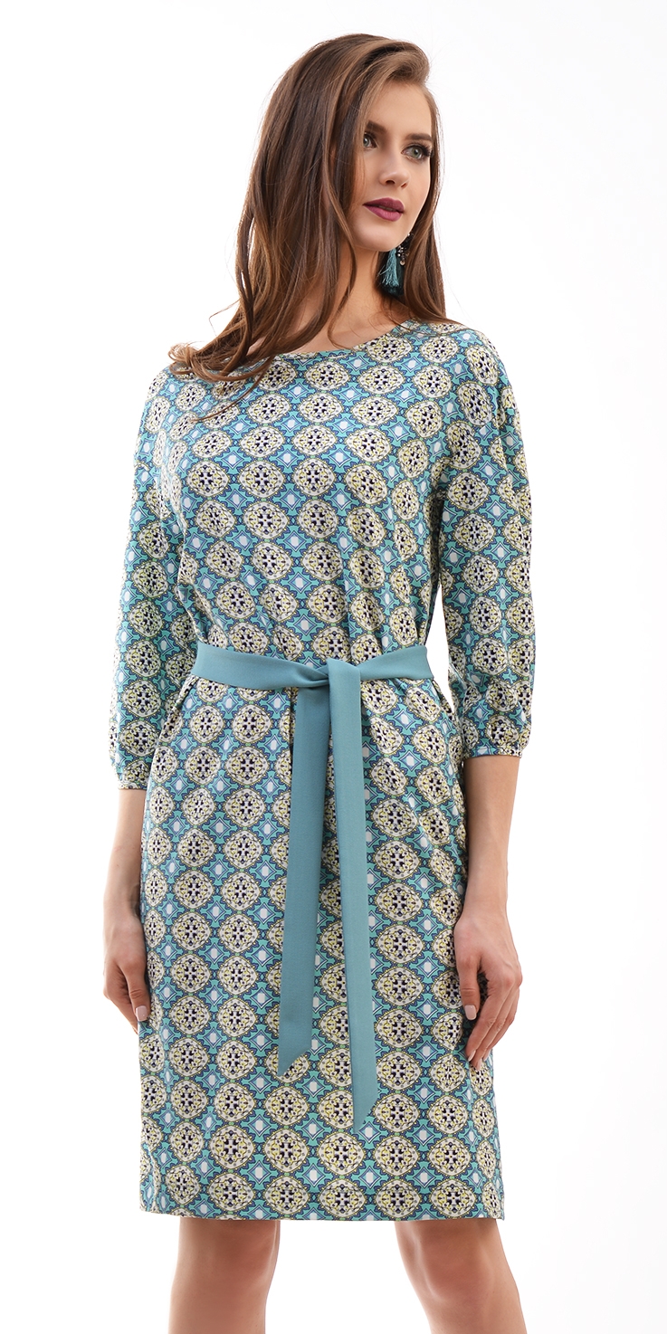 Платье прямого силуэта со спущенным плечом из яркой принтованной ткани. Объемный рукав 3/4 с защипами по низу, «капелькой» и застежкой на пуговицу. Вырез горловины овальной формы. На спинке «капелька» и застежка на пуговицу. Пояс в комплекте.