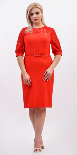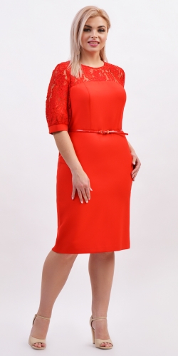 Платье-футляр из крепа и кружева. Рукав из кружева длиной до локтя на манжете. Вырез горловины округлый. По переду и спинке кокетки из кружева и рельефные швы. Платье отрезное по линии талии. На спинке средний шов и шлица. Застежка по спинке на потайную молнию и пуговицу. Ремень в комплекте.