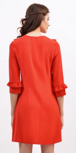 Стильное платье А-силуэта. Вырез горловины – круглый. Рукав 3/4 оформлен манжетом и рюшей. По переду кокетка треугольной формы и отделка рюшами. Спинка со средним швом и вытачками по линии талии. Застежка по спинке на потайную молнию.