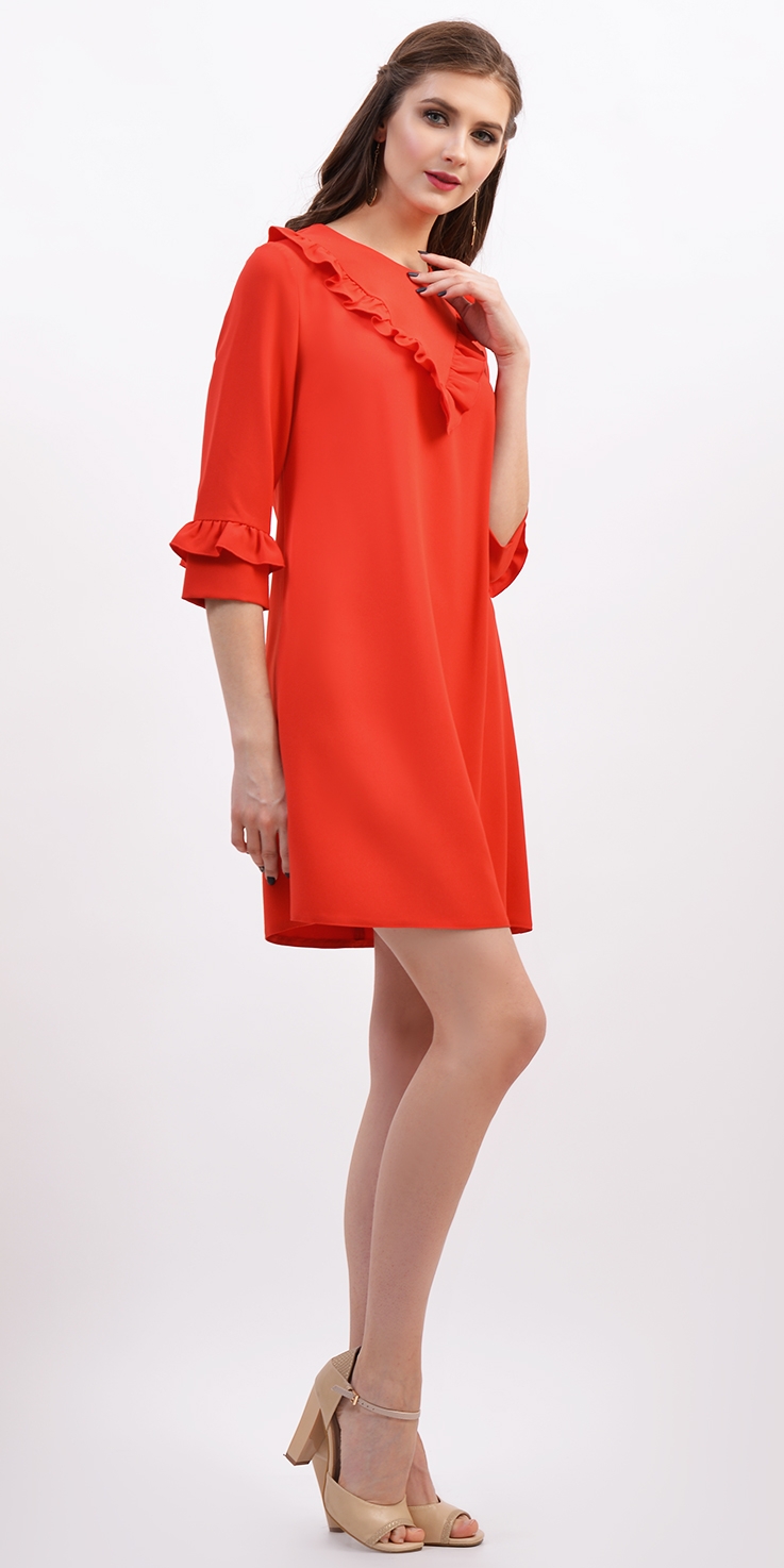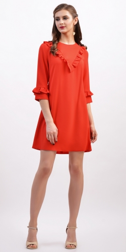 Стильное платье А-силуэта. Вырез горловины – круглый. Рукав 3/4 оформлен манжетом и рюшей. По переду
