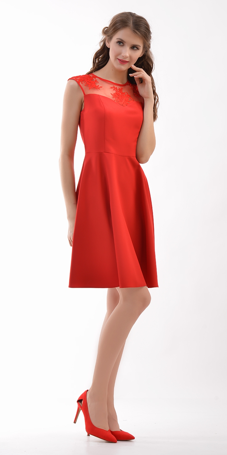 показать все описаниеНарядное платье из крепа и кружева. Вырез горловины округлый, плечо немного спущено. Платье отрезное по линии талии, лиф прилегающий, юбка расклешенная. На переде и спинке кокетки из кружева и рельефные швы. Застежка по спинке на потайную молнию и пуговицу.