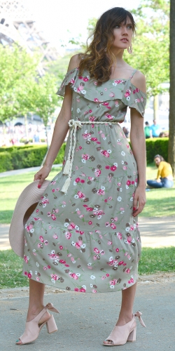 А наш сарафан на тонких лямках с открытыми плечами, воланами и плетеным поясом - настоящее творение дизайнеров. Он отлично будет смотреться на загорелой коже.